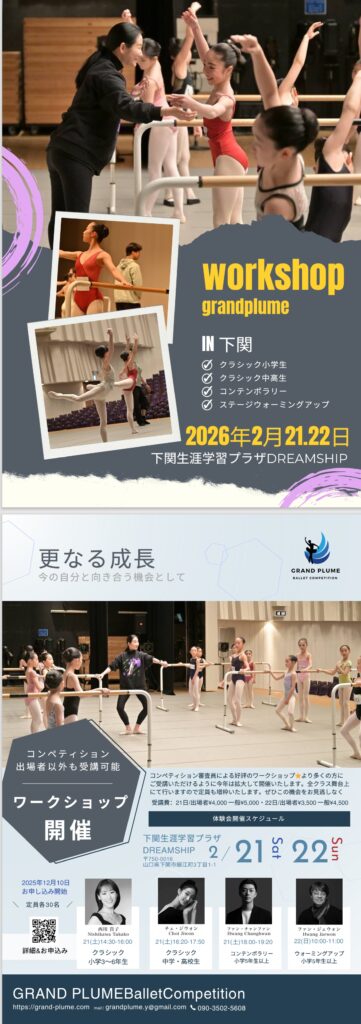 | ワークショップ | ①21日 クラシック小学3年生~6年生 14:30~16:00 ②21日 クラシック中・高校生 16:20~17:50 ③21日 コンテンポラリー(5年生以上) 18:00~19:20 ④22日 ウォーミングアップ(5年生以上) 10:00~11:00 |